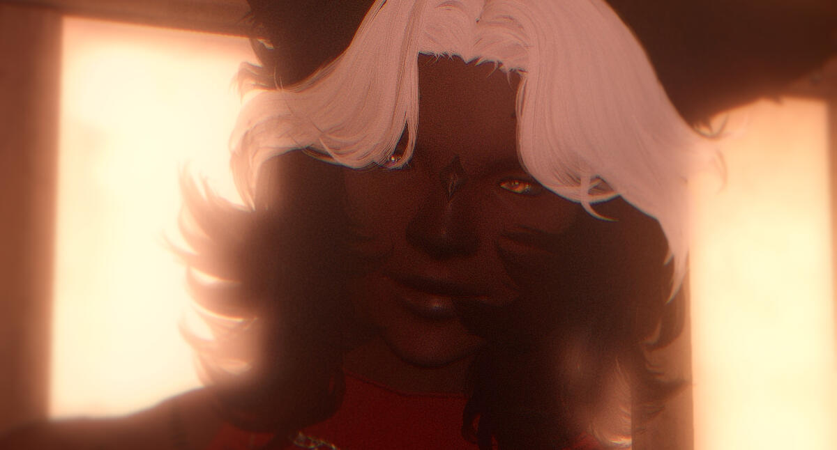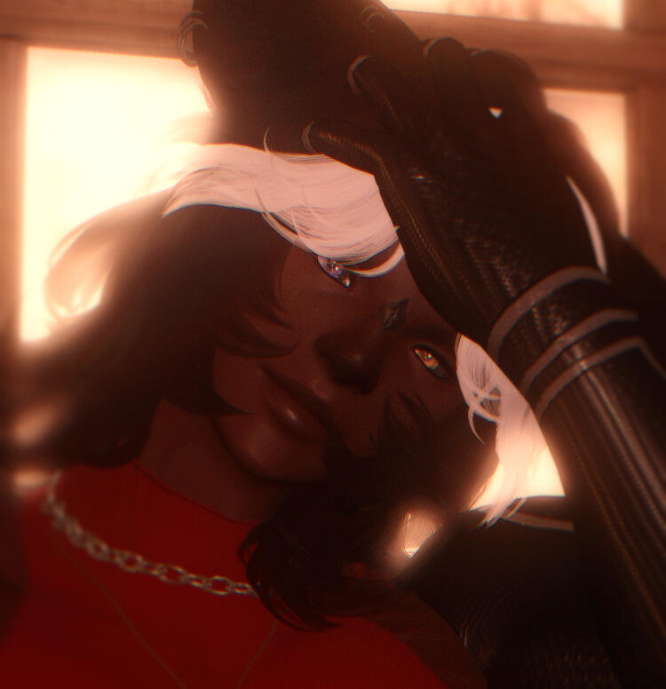 — skin. dark brown, covered in a myriad of freckles, scars, and beautiful black scales. his left arm and part of his left hip and leg are replaced with magitek technology. his magitek arm bears the symbol of garlemald on the inner elbow.