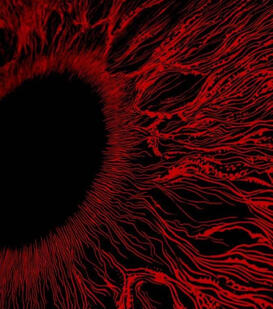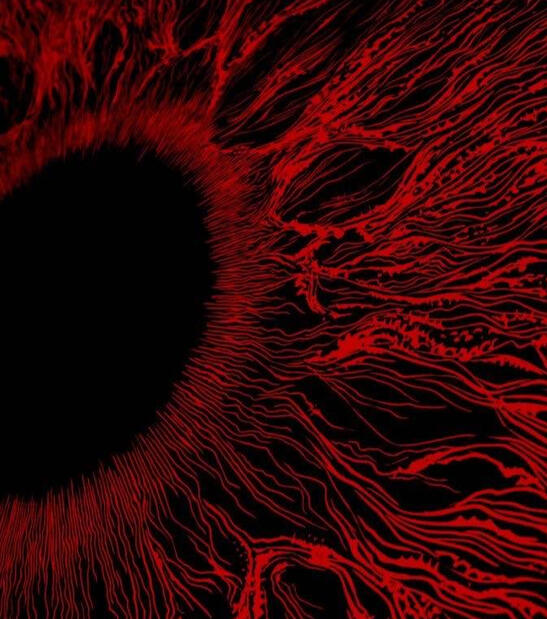 — eyes. mismatched blue and gold, with faintly glowing limbal rings and black sclera.